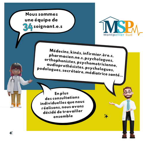 La MSP Montpellier Sud regroupe des professionnel.le.s de santé des Prés d'Arènes à Montpellier dans un projet commun (et non dans un lieu partagé). Médecins, infirmier.ère.s, pharmacien.ne.s, orthophonistes, kinésithérapeutes… nous avons choisis de travailler ensemble pour mieux accompagner les personnes que nous soignons.