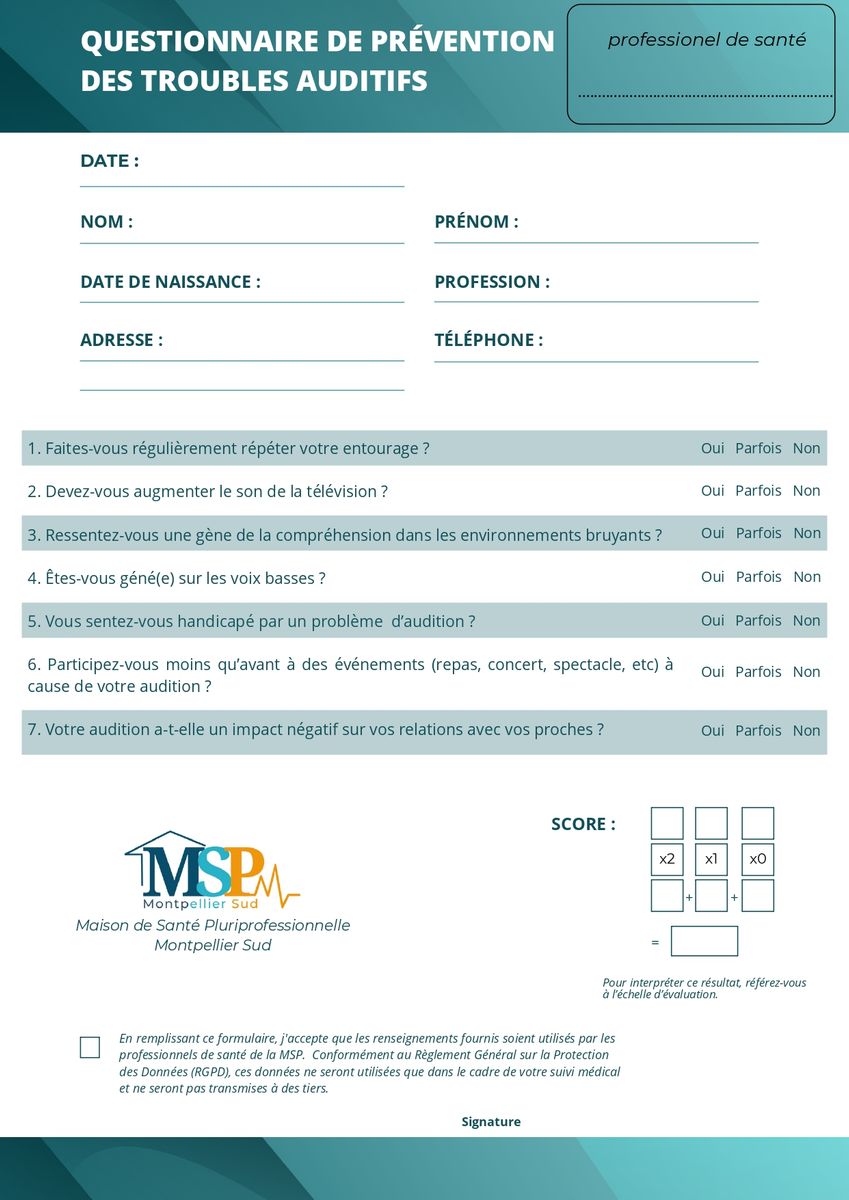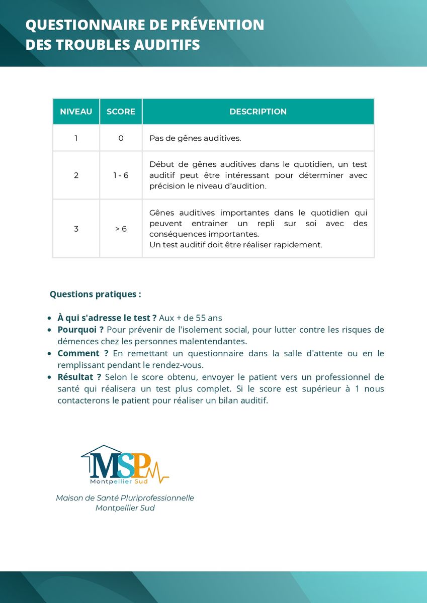 Aussi, au sein de la MSP Montpellier Sud, nous avons mis en place un outil pour un dépistage systématique de la perte d'audition pour tous et toutes nos patient.e.s de plus de 55 ans. Deux fois par an pendant trois semaines, les professionnel.le.s de santé de la MSP remettent aux patient.e.s un questionnaire à remplir. Dans le cas où des réponses suscitent une alerte, les personnes sont recontactées par les audioprothésistes de la MSP. Un bilan auditif plus poussé leur est proposé et une réponse adaptée à la situation est trouvée.